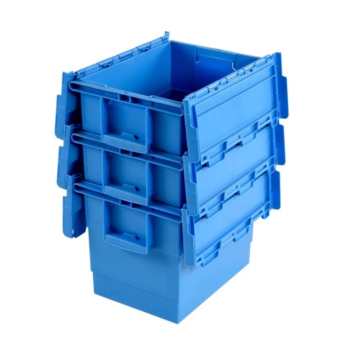 « Caisse avec couvercle intégré facilitant le transport et le stockage de vaisselle et d’autres accessoires de services en toute sécurité. Emboîtable à vide et gerbable pleine. »