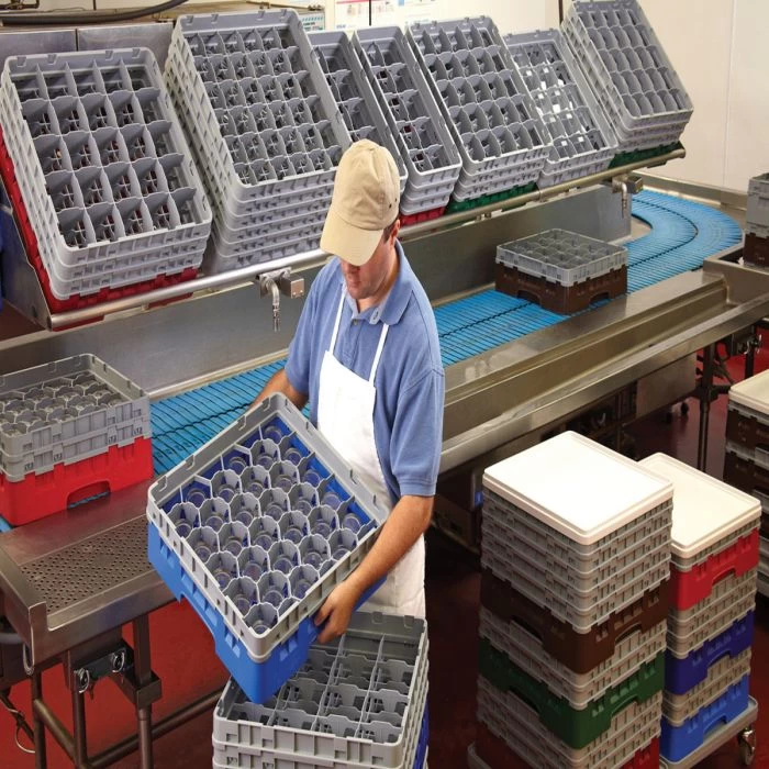 Solution de lavage, de transport et de stockage pour tout type de verre: LAVAGE EFFICAFE : Les compartiments internes ouverts permettent la circulation complète de l’eau et des solutions de nettoyage et favorisent le séchage rapide et à fond. Les casiers sont en polypropylène, un matériau résistant aux produits chimiques et à des températures élévées, jusqu’à 93°C. ENTEPOSAGE HYGIENIQUE : Des parois externes pleines évitent de laisser des empreintes de doigts sur les verres, empêchent les contaminants de pénétrer et limitent le risque de casse et de coupure. Grâce au couvercle et au chariot CAMDOLLY, ce système est entièrement fermé. Les verres entreposés restent propres, un seul lavage suffit. MEILLEURE GESTION DES STOCKS : Les diverses couleurs de casiers aident à reconnaître d’un coup d’oeil le contenu et la quantité par casier. TRANSPOT SUR ET HYGIENIQUE : Les casiers peuvent être transportés sur de longues distances au sein du même établissement mais également hors site en une seule unité. Les poignées faciles à sisir et les côtés lisses se chevauchant permettent un transport sûr.