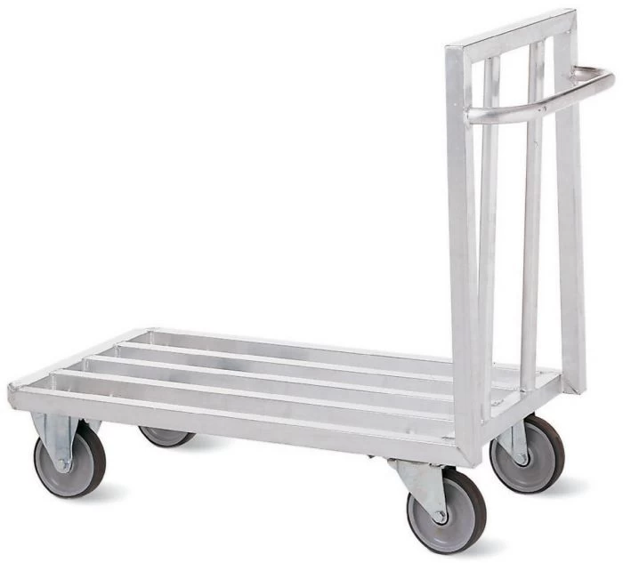 C’est un chariot à plate-forme à claires voies en aluminium avec dosseret de poussage.