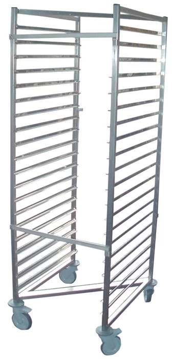 Construction en acier inoxydable, encastrable en Z. Structure tube carré 25 x 25 mm, épaisseur 1,2 mm, Soudures renforcées. Glissières double butée. Butoir en caoutchouc, douilles en inox soudées dans le tube. 4 roulettes en polyamide, dont 2 avec frein. Livré assemblé. Nombre de niveaux : 20 Format : 60 x 40 cm Entrée : 40 cm. Espacements entre les glissières : 7,5 cm