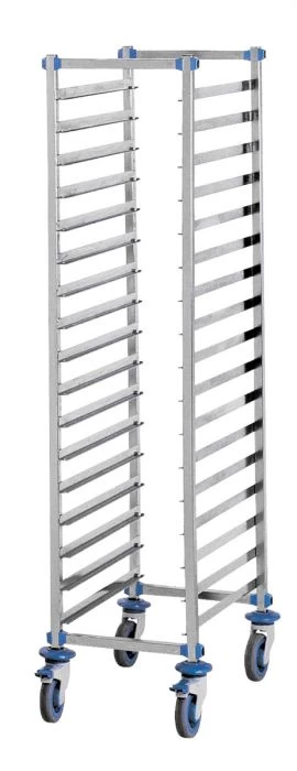 Construction en acier inoxydable. Montants tubes carré 25 x 25 mm. Glissières soudées argon avec butées d’arrêt en extrémité. 4 roulettes pivotantes polyamide Ø 12,5 cm dont 2 avec frein. Pare-chocs annulaires. Livré assemblé. Nombre de niveaux : 15 Format : GN 1/1 Entrée : 32,5 cm. Espacement entre les glissières : 8,1 cm.