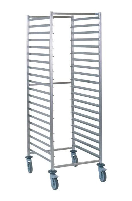 Construction en acier inoxydable. Montants tubes carré 25 x 25 mm. Glissières soudées argon avec butées d’arrêt en extrémité. 4 roulettes pivotantes polyamide Ø 12,5 cm dont 2 avec frein. Pare-chocs annulaires. Livré assemblé. Nombre de niveaux : 17 Format : GN 2/1 Entrée : 53 cm. Espacement entre les glissières : 8,1 cm.