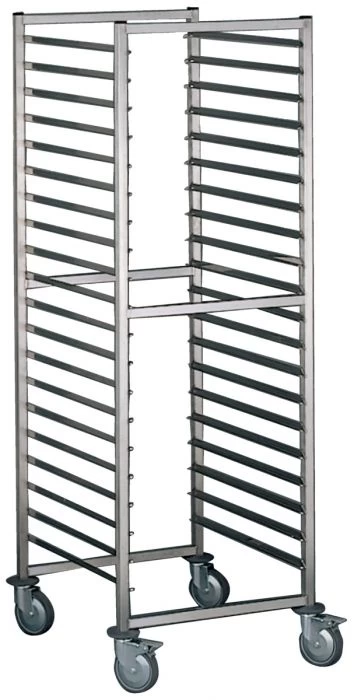 Construction en acier inoxydable. Montants tubes carré 25 x 25 mm. Glissières soudées argon avec butées d’arrêt en extrémité. 4 roulettes pivotantes polyamide Ø 12,5 cm dont 2 avec frein. Pare-chocs annulaires. Livré assemblé. Nombre de niveaux : 16 Format : 60 x 40 cm Entrée : 60 cm. Espacement entre les glissières : 9,4 cm.