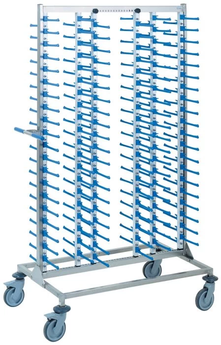 Structure en acier inoxydable. Montants supports de doigt en aluminium anodisé, tube 25 x 25 mm. Doigts anti-dérapants. Espace entre niveaux : 7 cm Supports réglables suivant la dimension des assiettes (jusqu’à 32 cm) 4 roues pivotantes Ø 12,5 cm, à chape polyamide dont 2 avec frein.
