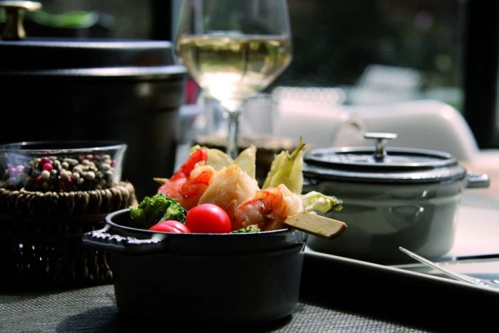 Bouton laiton ou nickelé adapté pour la cuisson au four. L’intérieur est émaillé en finition noir mat et permet d’obtenir une meilleure résistance aux chocs thermiques et aux rayures. Le système d’arrosage continu (l’intérieur du couvercle est plat et doté de picots) permet aux gouttes de condensation de retomber uniformément sur la préparation. Les arômes et les saveurs sont restitués dans toute leur intensité et les vertus nutritionnelles préservées.