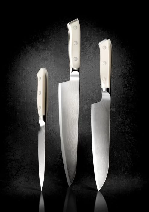 L’acier AUS 10, hautement chargé en carbone, permet une plus grande dureté au tranchant et ainsi une grande longévité à la coupe. L’alternance de feuilles d’acier 420 et 431, chargées en chrome et en nickel, garantit l inoxydabilité du couteau. Cela apporte un renforcement de la structure de la lame et une meilleure résistance aux chocs. Pourquoi 67 ? Car de part et d’autre de cette bande d’acier se trouvent 33 couches damassées, soit au total 67 couches. Tout en élégance, les couteaux DAMAS 67 sont dotés d’un manche en matériau haut de gamme de type « Corian », à base de roche blanche et de résine acrylique. Comparable au marbre pour sa dureté et ses belles couleurs, le manche présente une excellente résistance aux chocs, aux tâches, aux UV et aux bactéries.