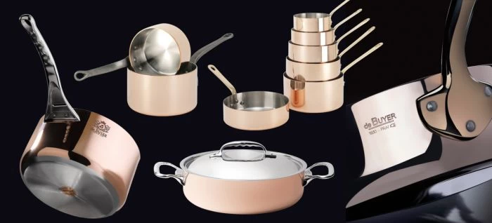 En cuivre et inox. Bord droit. Queue et anse ergonomiques à la «Française» rivetées en fonte d’inox.