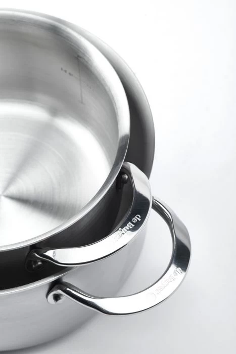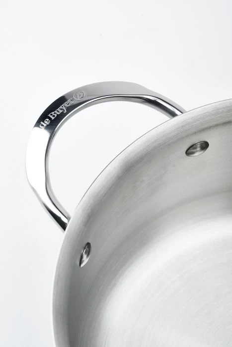 Les montures en fonte d’inox du faitout sans couvercle AFFINITY sont rivetées et les anses en fil inox sont résistantes et indéformables.