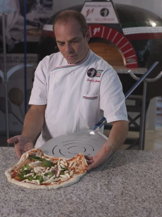 La perforation de la tête de la pelle s’adapte bien à ces mouvements: le dessin, la forme circulaire et la quantité d’orifices permettent d’évacuer parfaitement la farine si on pense à la gestuelle de travail typique de la tradition napolitaine.