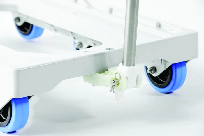 Facilite la manipulation des socles rouleurs. Permet de tirer et de pousser le socle sans effort. Revient systématiquement à sa position verticale. Nouveau système de fixation à goupille amovible.